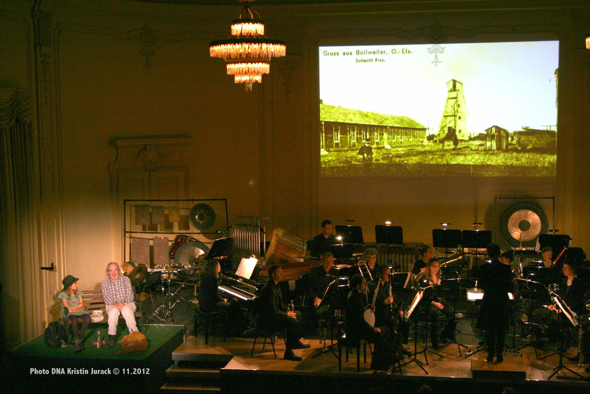 Foto von der fast ausverkauften Aufführung am 31. Oktober 2012 im Stadt-Casino Basel. Von links: Emma (petit enfant) mit Urs Bihler (Grandpapa), das Orchester basel sinfonietta und am Pult: Valérie Seiler, Dirigentin aus Wittenheim. Foto DNA Kristin Jurack, © 2012, zVg